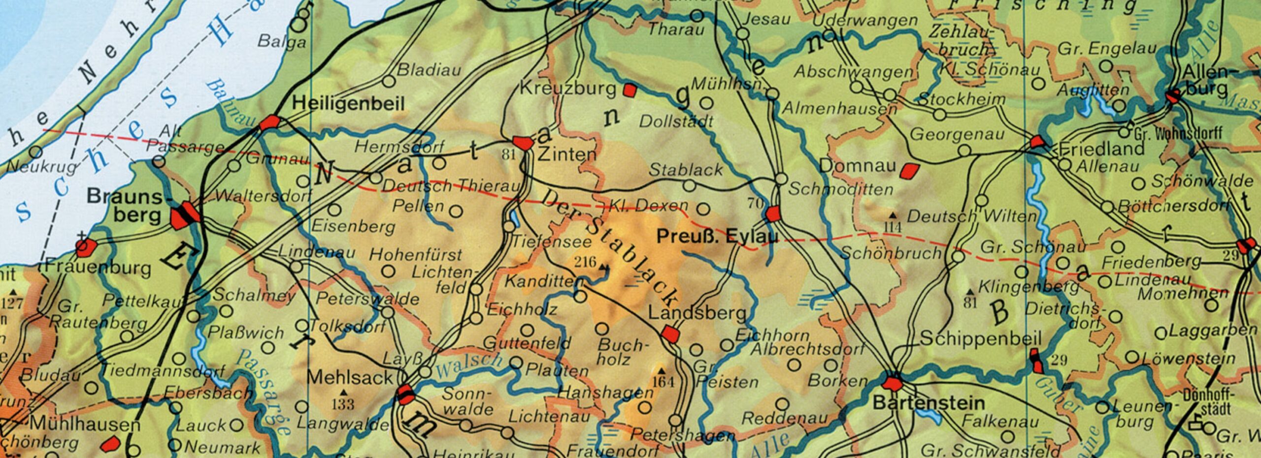 Hier links sehen Sie eine Ostpreußenkarte mit den eingezeichneten Grenzen des ehemaligen Kreises Preußisch Eylau.